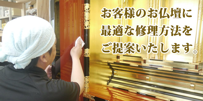 お仏壇の修理には多くの工程があり、また、お客様のお仏壇の状態は異なります。一つ一つ必要な作業をいつもさせていただきお客様のお仏壇に最適な可能な限りリーズナブルな方法を方法をご提案させて頂きます。